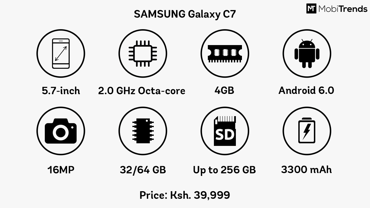 The Samsung Galaxy C7 has a suggested retail price of Ksh.39,999 in Kenya.